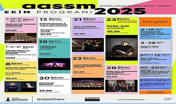 İzmir Büyükşehir Belediyesi Ahmed Adnan Saygun Sanat Merkezi (AASSM), ekim ayında sanatseverleri birbirinden farklı sanat organizasyonları ile buluşturacak. İzmir Oda Orkestrası’nın açılış konseri, Metalica & Symphony konseri ve Fazıl Say konseri yine unutulmazlar arasında yer alacak. İzmir Oda Orkestrası Cumhuriyet Bayramı Konseri ise coşkuyu doruğa çıkaracak.