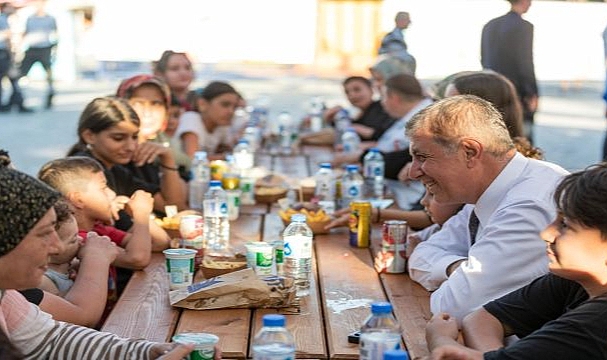İzmir Büyükşehir Belediye Başkanı Dr. Cemil Tugay, kentin farklı noktalarında bulunan Dayanışma Noktalarından misafir edilen anne ve çocuklarla 94. İzmir Enternasyonal Fuarı’nda buluşmaya devam ediyor. Kültürpark’taki yeme içme alanında çocuklarla bir araya gelen Başkan Dr. Cemil Tugay, miniklerin taleplerini dinledi.