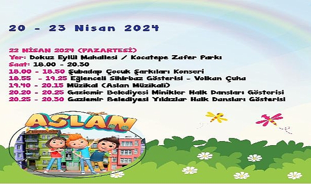 Gaziemir Belediyesi’nin 23 Nisan Ulusal Egemenlik ve Çocuk Bayramı kutlamaları kapsamında düzenleyeceği 26. Gaziemir Ulusal Çocuk Şenliği başlıyor. 20-23 Nisan tarihlerinde düzenlenecek şenlik kapsamında her gün ilçenin farklı bir bölgesinde çocuklar için etkinlikler düzenlenecek. Şenlikte sahnelenecek müzikallerle, çocuklar sevdikleri çizgi film kahramanlarıyla bir araya gelecek. Kukuli, Pijamaskeliler, Aslan, Kral Şakir Kapadokya Macerası gibi müzikal gösterileriyle ve Şubadap Çocuk Şarkıları Konseri, Volkan Çuha Eğlenceli Sihirbaz Gösterisi’yle çocuklar keyifli saatler yaşayacak. gaziemir belediyesi Halk Dansları Topluluğu’nun minikler ile yıldızlar grupları da danslarıyla şenliğe renk katacak.