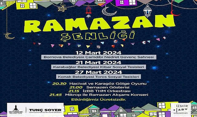 İzmir Büyükşehir Belediyesi, sevgi, kardeşlik ve hoşgörü ayı Ramazan'da farklı noktalarda yaptığı iftar organizasyonları sonrası Ramazan Şenliği düzenliyor. İlk şenliği 12 Mart Salı günü (bugün) Bornova Belediyesi Çamdibi Nedret Güvenç Sahnesi’nde düzenleyecek İzmir Büyükşehir Belediyesi, iftar sonrası yüzlerce yıllık geçmişe sahip gölge oyunlarını da vatandaşlarla buluşturacak. Eski Ramazan geleneğini sürdürmek ve mahalle dayanışmasını ön plana çıkarmak için her sene düzenlenen Ramazan Şenliği’nde ayrıca Semazen Gösterisi, İzmir Büyükşehir Belediyesi Türk Halk Müziği Orkestrası konseri de İzmirlilerle buluşacak. Ücretsiz olacak etkinlikler saat 20.30’da başlayacak. Ayrıca şenliğe katılanlara geleneksel kıyafetlerle limonata, kağıt helva, dondurma ikramı yapılacak.Ramazan Şenliği buluşmalarının ikincisi 21 Mart Perşembe akşamı Karabağlar Belediyesi Kibar Sosyal Tesisleri’nde, üçüncüsü ise 27 Mart Çarşamba akşamı Konak Belediyesi Toros Tesislerinde düzenlenecek.