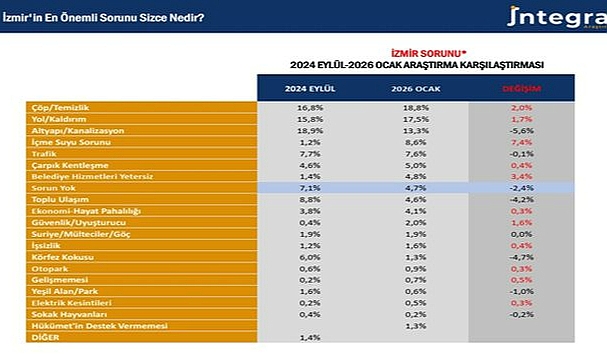 İntegral Araştırma tarafından yapılan açıklamada şu görüşlere yer verildi: İzmir, yerel yönetim performansı ile toplumsal beklenti arasındaki makasın tehlikeli biçimde açıldığı bir "Eşik noktasına" doğru ilerlemektedir. Özellikle 2018’den bu yana yaşam memnuniyetinde gözlenen 32 puanlık radikal düşüş, kentin kronikleşen çöp, yol ve altyapı gibi temel belediye hizmetlerindeki yetersizliklerle birleştiğinde, İzmirlilik kimliğinin taşıyıcı kolonu olan "Konforlu yaşam" algısının ciddi bir erozyona uğradığını göstermektedir. Şehrin en önemli sorunlarının %84 oranında yerel yönetim odaklı olması ve "Sorun yok" diyenlerin oranının %4,7 gibi marjinal bir seviyeye gerilemesi, önümüzdeki dönemde seçmen davranışında ideolojik bağlılıktan ziyade "Hizmet odaklı bir kopuş" yaşanma ihtimalini güçlendirmektedir.