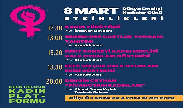 8 Mart Dünya Emekçi Kadınlar Günü sebebiyle Efes Selçuk’ta düzenlenecek etkinlikler saat 12.30’da İstasyon Meydanı’ndan yürüyüş ile başlayacak. Yürüyüş sonunda etkinlikler, Atatürk Anıtı önünde SEGEM-DER tarafından hayata geçirilen Dostluk Yorganı adlı çalışmanın tanıtımı ile devam edecek.